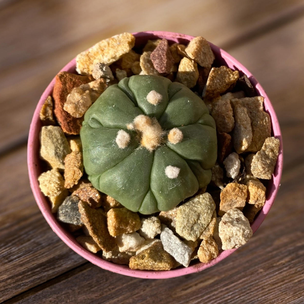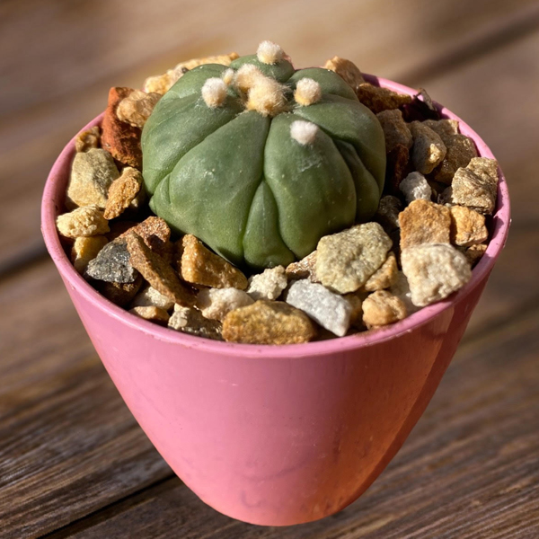Caring for Astrophytum asterias var nudum cv Fukuryu requires similar practices to its non-crested counterparts. This cactus thrives in well-draining soil and prefers bright sunlight to maintain its vibrant coloration and promote healthy growth. However, it is essential to protect it from intense, direct sunlight during the hottest hours of the day to prevent sunburn. Like other cacti, Fukuryu benefits from infrequent watering, allowing the soil to completely dry out between waterings to prevent the risk of root rot. With its distinctive crested and monstrose features, the Astrophytum asterias var nudum cv Fukuryu adds a touch of whimsy and intrigue to any succulent collection, making it a true focal point and conversation starter.